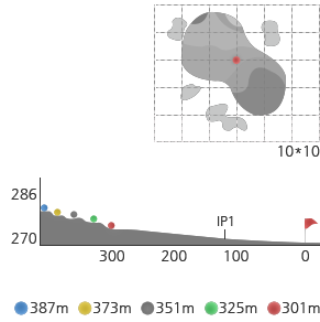 F/W에서 그린까지 단 하나의 벙커도 없는 홀이지만, IP Zone과 그린사이 해저드가 있어 위험에 처할 수 있습니다.