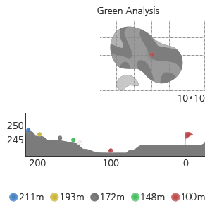 Green Angle이 좌측을 향하고 있으므로 티샷은 F/W 중앙보다는 좌측으로 보내는 것이 유리합니다.