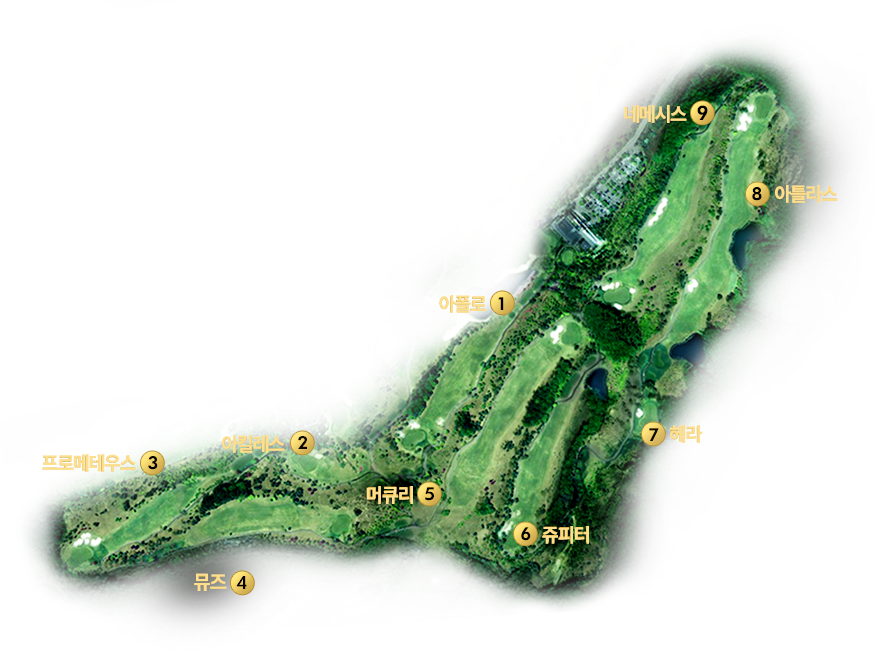 1홀에서 9홀까지 자연적인 지형과 지세를 살려 설계된 밸리 코스 플레이어의 탄생을 알리는 아폴로, 강하고 대담한 티샷을 요구하는 프로메테우스와 아틀라스, 주변의 경관이 아름다운 뮤즈와 헤라, 다양한 전략을 구사해야 하는 머큐리, 역전의 기회를 노릴 수 있는 네메시스. 자연적인 지형과 지세를 살려 설계된 밸리코스에서 골프의 참맛을 느껴 보십시오.