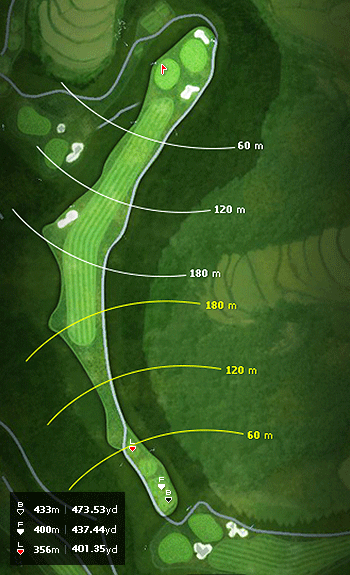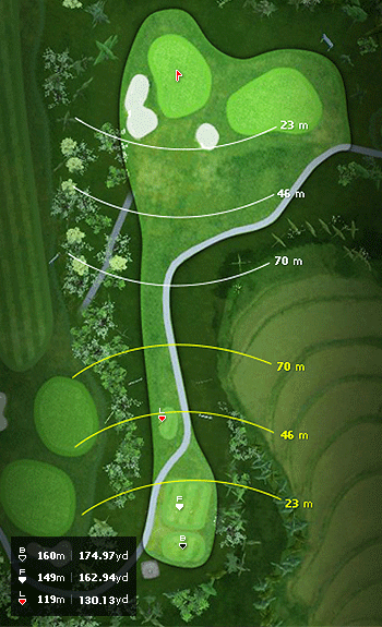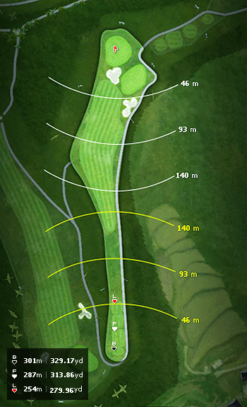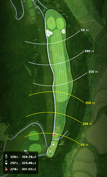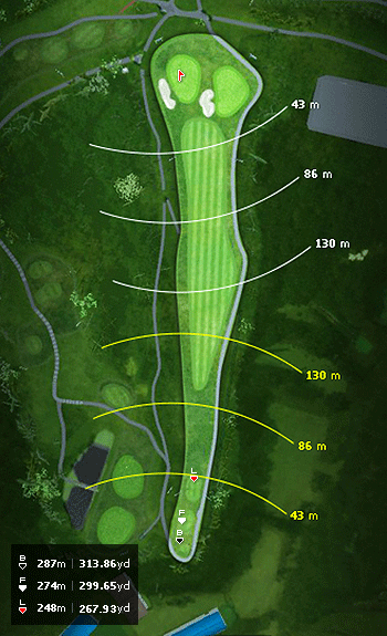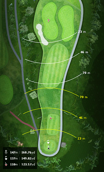 2중 그린, 클럽 선택이 중요한 홀 평탄한 홀이나 2중 그린이고 좌그린의 경사가 심하여 세심한 퍼팅을 요하는 홀. 우그린일 때 8 ~ 9번 아이언으로 공략이 가능한 홀이나 좌그린일 때 7 ~ 6번 아이언으로 공략하여야 하고 2중 그린이므로 클럽 선택에 많이 유의하여야 한다.