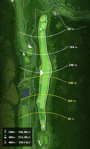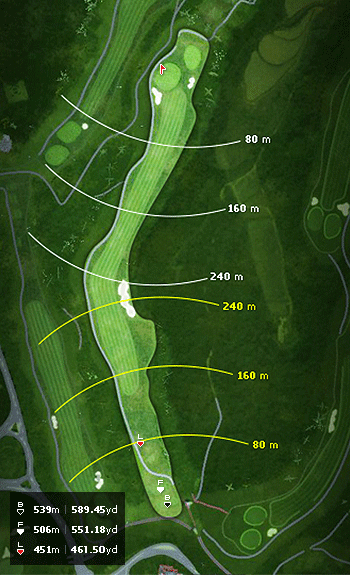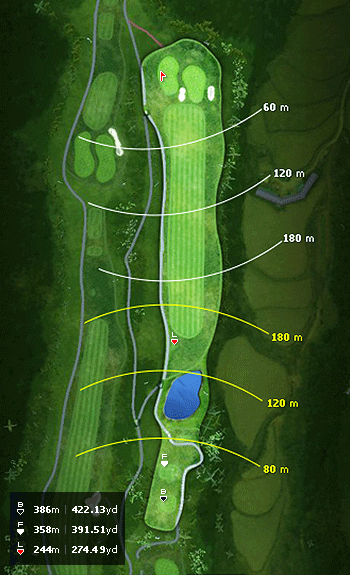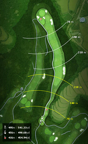 Tee Shot을 중좌로하여 공략이 필요한 홀 페어웨이 폭이 좁고 상당한 거리가 있는 홀, Tee Shot을 중좌로하여 공략. Tee Shot을 중좌로 하여야 하며 Second Shot 거리는 130~ 140m 정도의 거리가 남기 때문에 클럽 선택을 잘 하여야 한다.